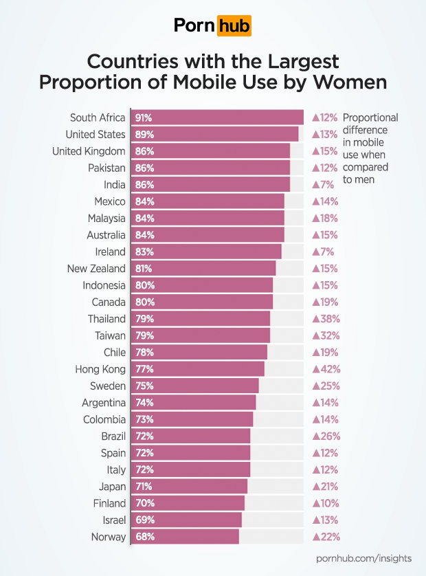las mujeres mexicanas, son las más interesadas en consumir más pornografía que los hombres, por medio de la tecnología. Según el sitio, 71% de las mujeres consume pornografía lo hace a través de un smartphone.