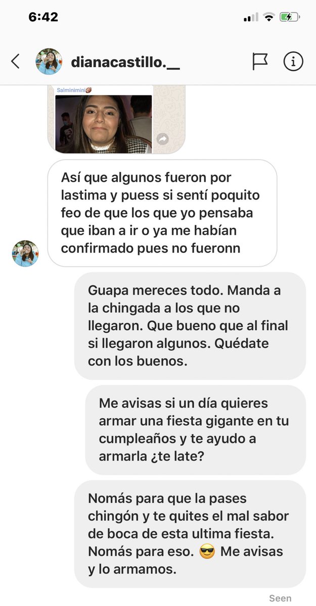 La joven quiso festejar a lo grande, contrató un DJ, compró botana y bebidas, y preparó hot dogs, pero a la mera hora sólo llegaron tres personas a su fiesta. Una de sus amigas compartió su video en Tik Tok y en pocas horas se hizo viral en otras redes sociales por lo que hasta famosos se enteraron.La cantante mexicana, Elán, pidió ayuda en Twitter para encontrarla y "armarle un fiestón", pero eso sí, no invitaría a los que no fueron a su primera fiesta. Finalmente Elán encontró a Diana en Instagram y ella le platicó que luego de que se hiciera viral el video, algunos de los invitados lo vieron y sólo fueron por "lástima".Jovencita hace MEGA fiesta de cumpleaños y sólo asisten tres personas. ? pic.twitter.com/k7eAsOuEEU