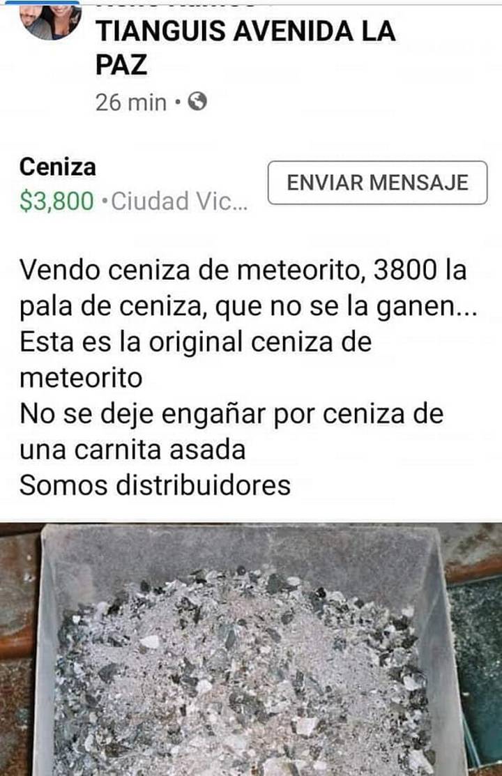 "Vendo ceniza de meteorito, 3800 la pala de ceniza, que no se la ganen... Esta es la original ceniza de meteorito. No se deje engañar por ceniza de una carnita asada", dice uno de los anuncios en Ciudad Victoria.