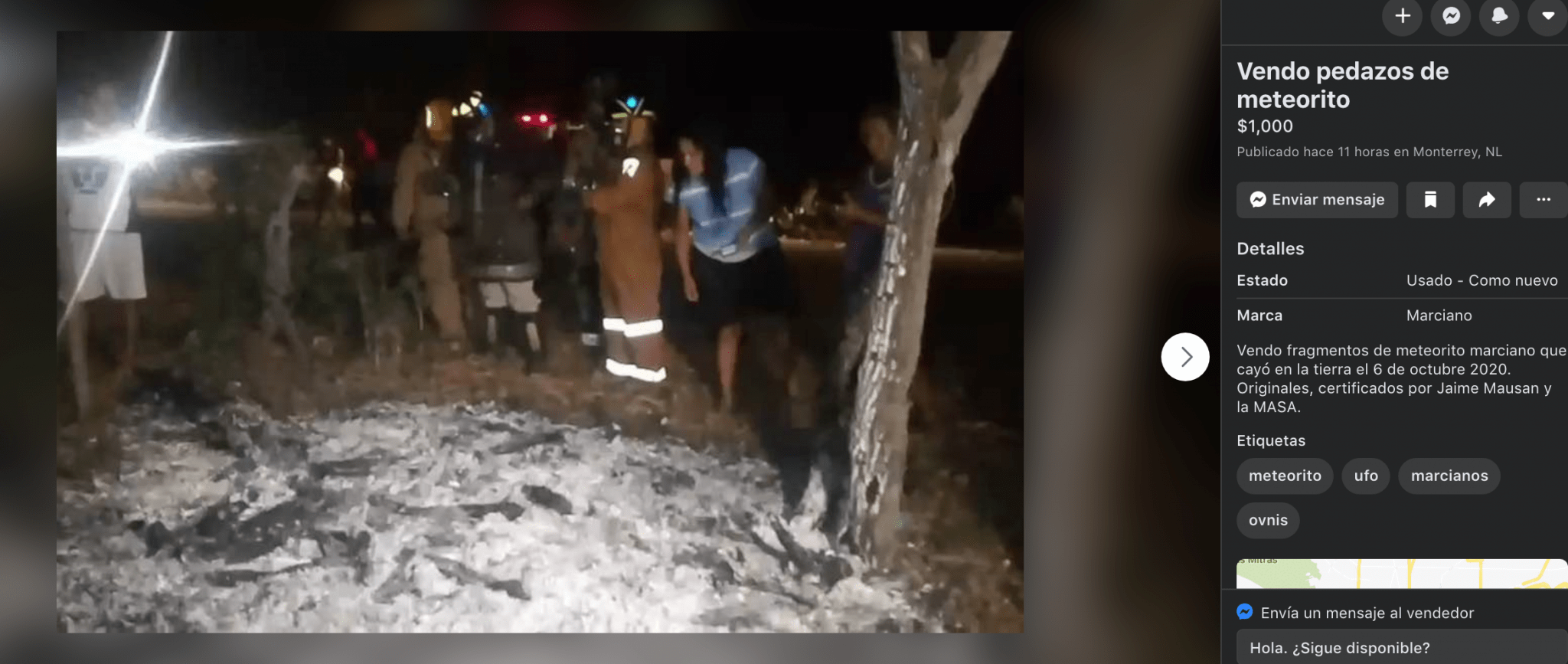 A través de Marketplace, en Facebook, han aparecido varios anuncios donde ofrecen cenizas y partes del meteorito con precios que van desde los 3 mil hasta los 10 mil pesos.Aseguran que #Meteorito visto en #Monterrey cayó en #CiudadVictoria. Autoridades inspeccionan la zona.@Cicmty pic.twitter.com/KE09NA2ms4