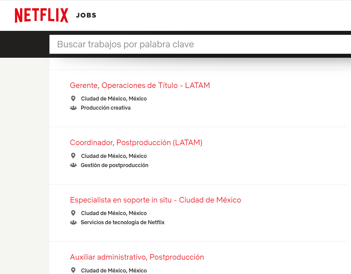 Actualmente Netflix tiene disponibles vacantes para editor de video, analista de derechos, gerente de marketing, auxiliar administrativo, gerente de operaciones, coordinador de postproducción, entre otras.