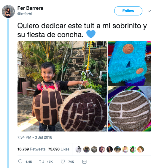 La historia fue difundida por Fer Barrera, quien publicó en su cuenta de Twitter las fotos de su sobrino disfrazado de una concha, junto a un pastel en forma del pan de dulce y una piñata del tema de la fiesta.