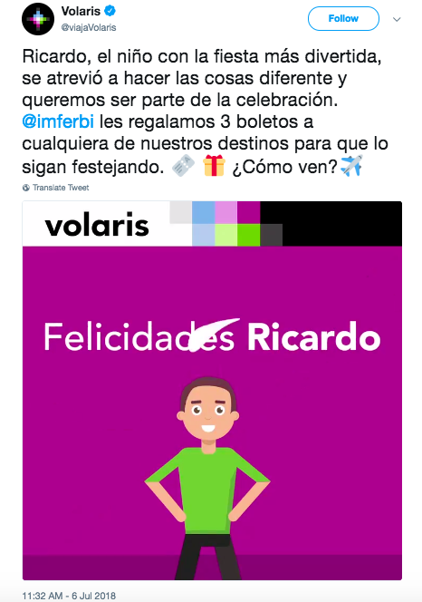 La publicación rápidamente cobró viralidad en redes, obteniendo mas de 77 mil ‘Me gusta’y 16 mil retweets, por lo que llamó la atención de marcas como Bimbo, El Globo y Volaris.