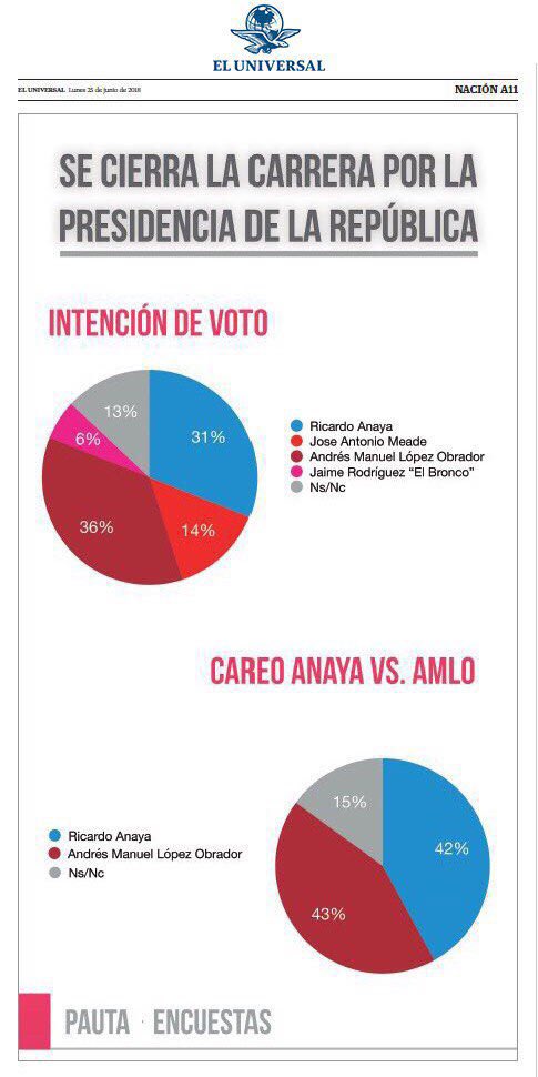 La encuesta mostraba el logo del diario El Universal, y muestra a Anaya con 31%, sólo cinco puntos por debajo de AMLO,quien tiene 36% de las preferencias, mientras a Meade lo dejan con 14 por ciento. A la encuesta la acompaña otro gráfico titulado ‘Careo Anaya vs AMLO’, que pone a los candidatos en un empate técnico con 42% y 43%, respectivamente.