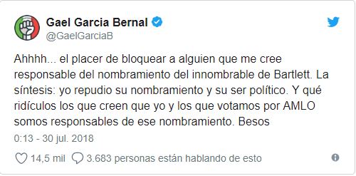 "Ahhh... el placer de cloquear a alguien que me cree responsable del nombramiento del inombrable de Bartlett. La síntesis: yo repudio su nombramiento y su ser político. Y qué ridículos son los que creen que yo y los que votamos por AMLO somos responsables de ese nombramiento. Besos".
