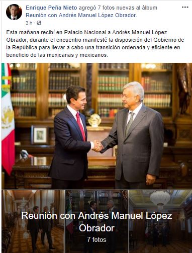 El encuentro generó bastante expectativa y cuando terminó, Obrador ofreció un mensaje a medios en el que informó que acordaron una transición pacífica y dijo que trabajarán de manera conjunta la renegociación del Tratado de Libre Comercio de América del Norte (TLCAN). Pero lo que más causó ruido en las redes fueron las fotos de la reunión que se difundieron a través de la cuenta oficial del presidente.
