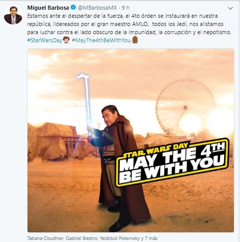 El aspirante decidió 'transformarse' en un jedi con ayuda del Photoshop y aventarse un tuit sobre cómo estábamos ante el despertar de la fuerza liderados por "el gran maestro" López Obrador:
