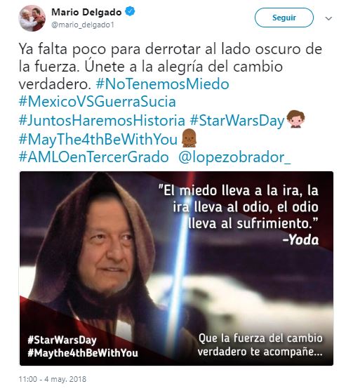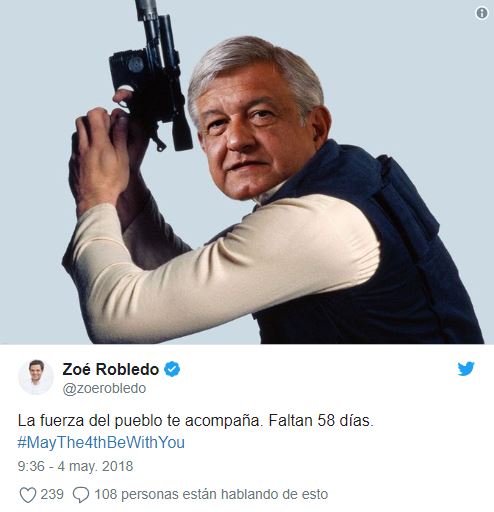 Y aparentemente no es el único que visualiza a AMLO dentro del universo Star Wars, Zoé Robledo, candidato a diputado federal por Morena, lo ve como Han Solo.