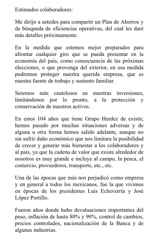En las redes sociales comenzó a circular una carta atribuida al presidente y director general de Grupo Herdez, Héctor Hernández-Pons, en la que pide a sus trabajadores prepararse ante cualquier escenario económico derivado de las elecciones.