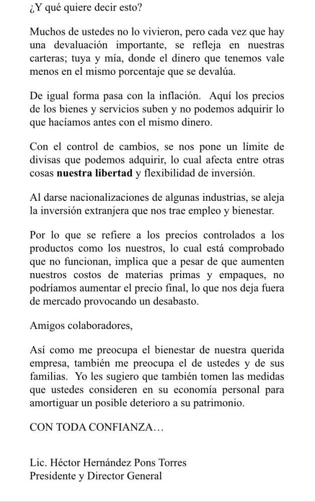 “En la medida que estemos mejor preparados para afrontar cualquier giro que se pueda presentar en la economía del país, como consecuencia de las próximas elecciones, o que provenga del exterior, en esa medida podremos proteger nuestra querida empresa, que es nuestra fuente de trabajo y sustento familiar”, se lee en la misiva.