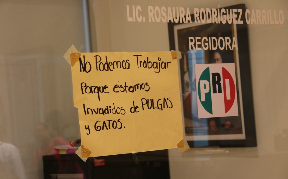 Con una pancarta que dice “no podemos trabajar porque estamos invadidos de pulgas y gatos”, la regidora priista Rosaura Rodríguez Carrillo denunció la situación y señaló que lleva más de una semana sin poder atender a las personas que van a hacer trámites.