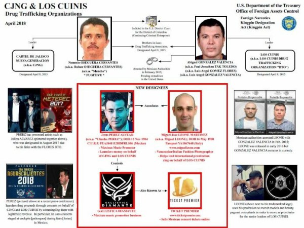 "'Chucho Pérez' tiene estrechos vínculos con la familia de Abigael González Valencia, líder de Los Cuinis, y se enfoca principalmente en promover conciertos en grandes ferias mexicanas, como los que se llevan a cabo en Aguascalientes y Metepec. Chucho Pérez usa la violencia para obtener concesiones para operar estos conciertos bajo el nombre de su negocio de promoción musical, Gallistica Diamante (alias “Ticket Premier”)", señala el documento enviado por las autoridades estadounidenses.