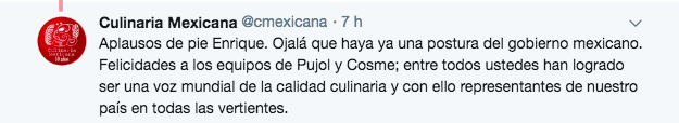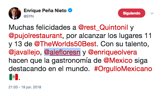 Hasta el momento, Peña Nieto no ha dicho nada sobre esta situación y envió a Luis Videgaray para hacerlo, pero mientras tanto prefirió felicitar a los prestigiados chefs mexicanos, Enrique Olvera y Jorge Vallejo, porque sus restaurantes Pujol y Quintonil están en el top 20 de los mejores 50 del mundo.