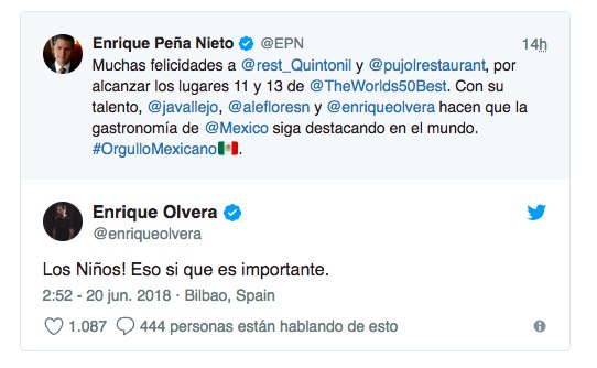 Las críticas llegaron por todos lados, pero lo que sorprendió a los tuiteros fue la manera en que respondió el chef Enrique Olvera, quien en vez de agradecer las palabras de Peña, también se unió al llamado para que ponga manos a la obra y apoye a los niños inmigrantes mexicanos.