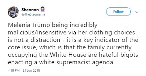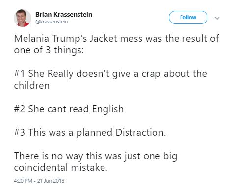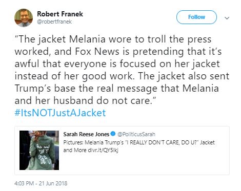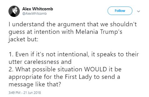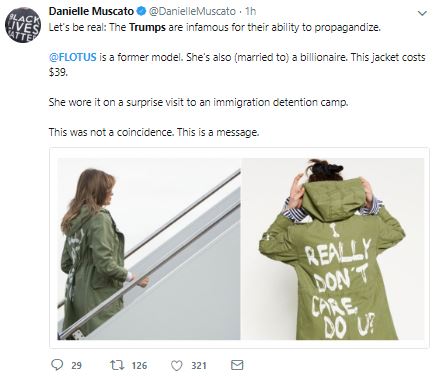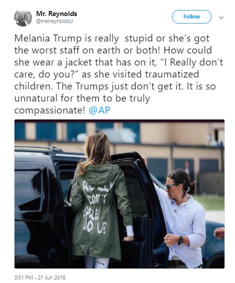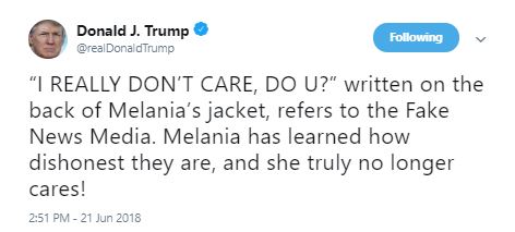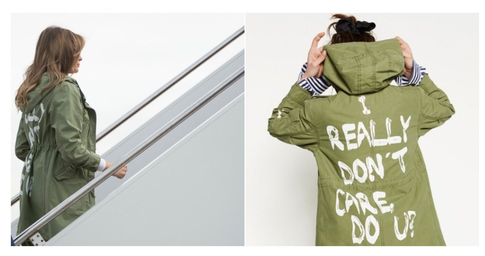 Melania usó una chaqueta que llevaba escrita la frase "I really don't care. Do U?" ("Realmente no me importa. ¿Y a ti?") y las fotografías hicieron estallar a las redes contra una elección que consideraron como extraña e insensible para la ocasión, otros opinaron que era un deliberado intento por desviar la atención del problema.