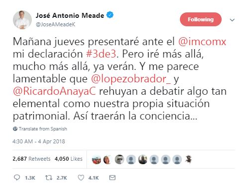 Y hoy volvió recargado para anunciar que este jueves no sólo presentará su declaración 3de3, sino que ira "mucho más allá" que los candidatos de "Juntos haremos historia" y "Por México al Frente":