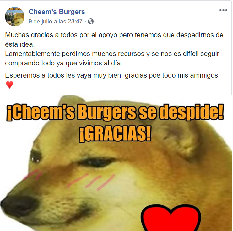 "Muchas gracias a todos por el apoyo pero tenemos que despedirnos de ésta idea. Lamentablemente perdimos muchos recursos y se nos es difícil seguir comprando todo ya que vivimos al día", señalaron los dueños.