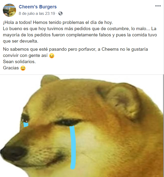 "Lo bueno es que hoy tuvimos más pedidos que de costumbre, lo malo... La mayoría de los pedidos fueron completamente falsos y pues la comida tuvo que ser devuelta", escribieron en su cuenta de Facebook.