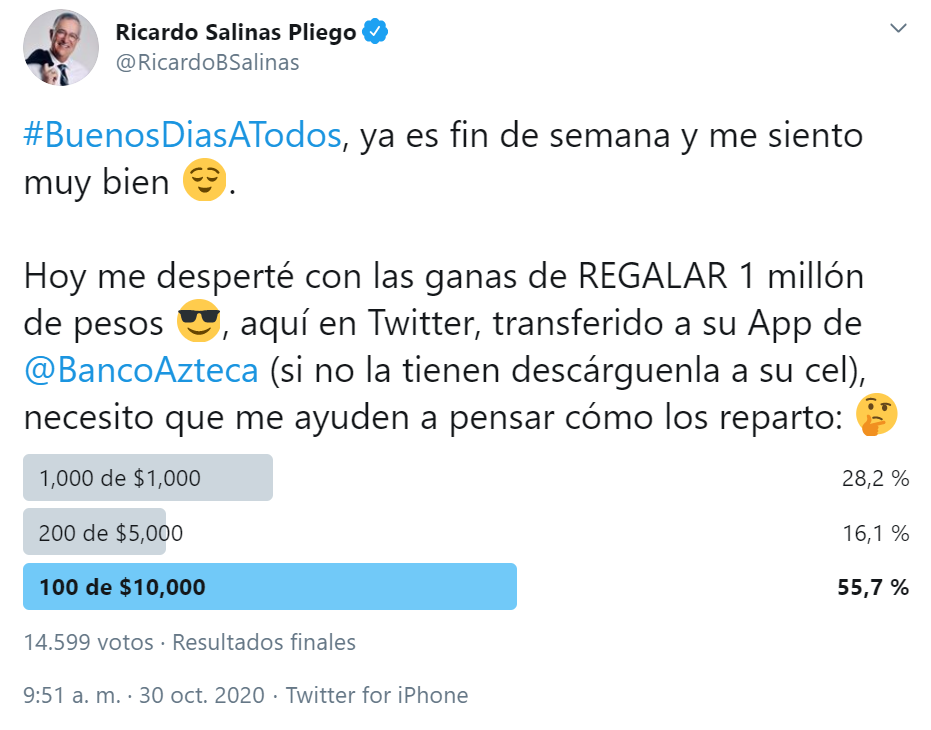 "Ya es fin de semana y me siento muy bien. Hoy me desperté con las ganas de REGALAR 1 millón de pesos, aquí en Twitter, transferido a su App de @BancoAzteca (si no la tienen descárguenla a su cel)", escribió el pasado 30 de octubre
