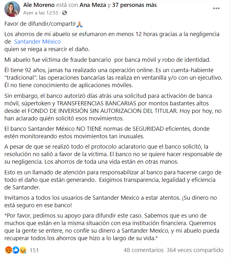A través de redes sociales, una usuaria identificada como Ale Moreno, denunció que su abuelo había sido víctima de un fraude bancario y había perdido todos los ahorros que tenía guardados en Santander.