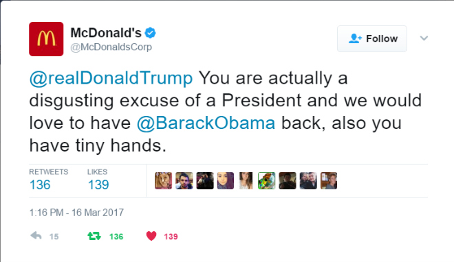 En el breve mensaje, 'McDonald's' dijo que Trump es 'una excusa grotesca de presidente y que además de desear que Obama vuelva a ser presidente, tiene manos diminutas'.