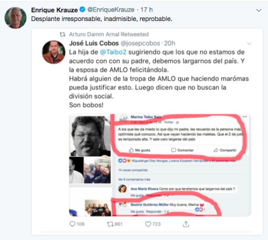 Justo ocurrió con el mensaje publicado por el periodista Ricardo Alemán el fin de semana, y también surgió otro de la hija de Paco Ignacio Taibo II, mismo que fue duramente criticado.