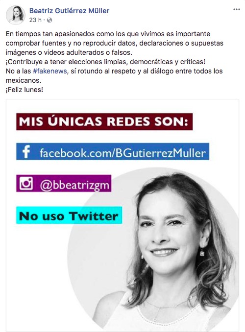 Sin embargo, horas más tarde se supo que la cuenta de Gutiérrez Müller era falsa, incluso ella publicó en su cuenta de Facebook cuáles son las redes que utiliza y cuáles son sus usuarios para evitar la propagación de noticias falsas.