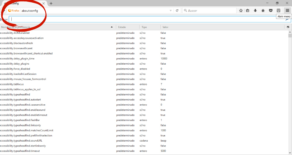 about:config en la barra de direcciones (presiona ‘Enter’).