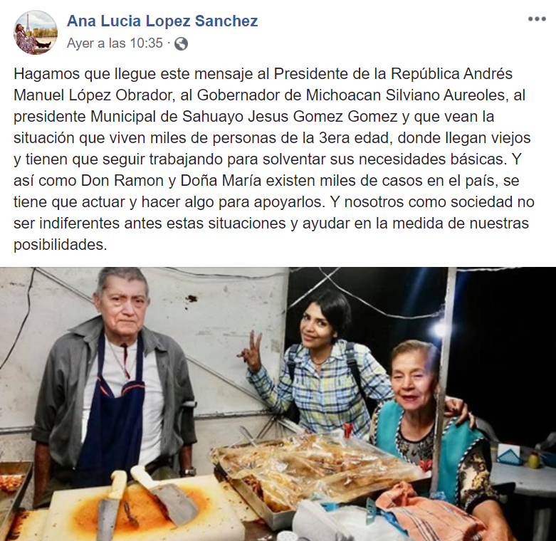 Ana agradeció el apoyo a la pareja, pero también pidió al presidente López Obrador y al gobernador de Michoacán que ayuden a los adultos mayores que lo necesitan.