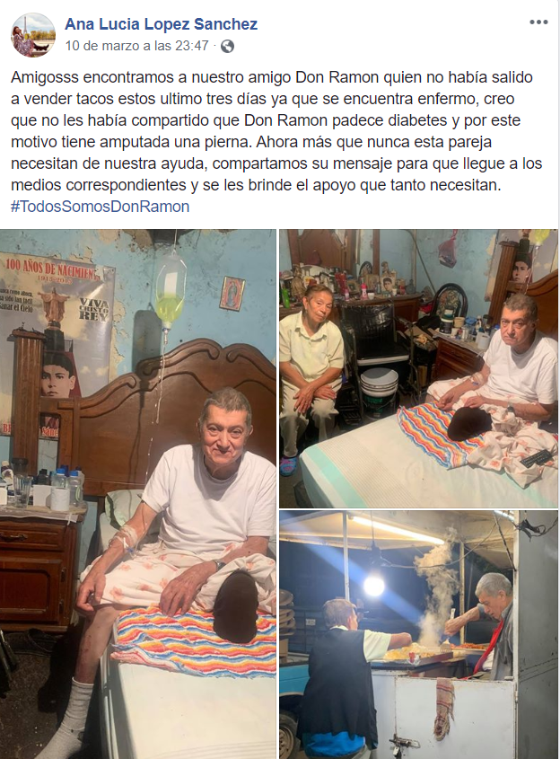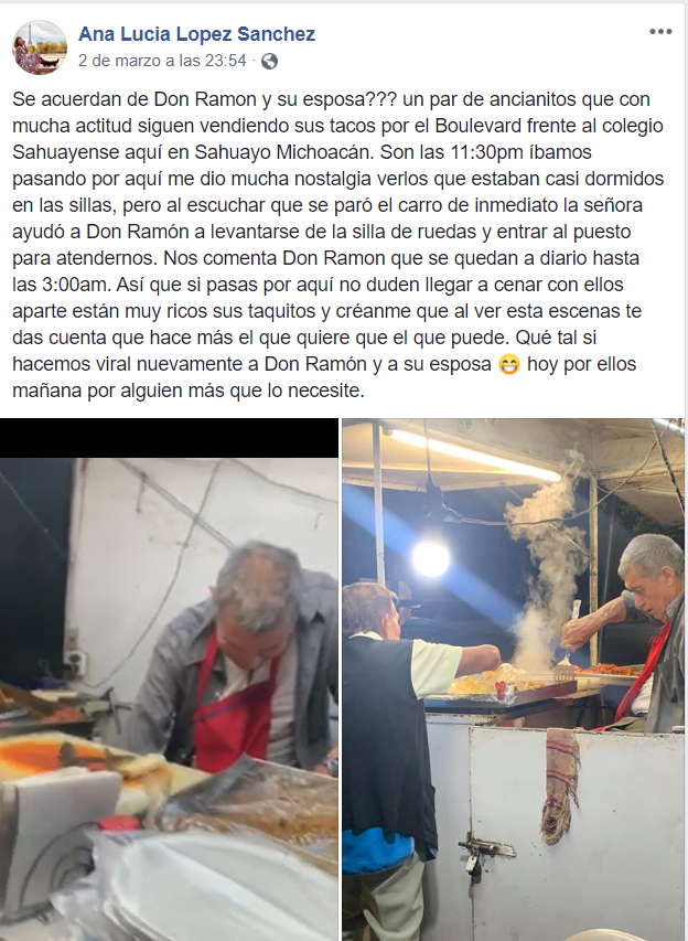 "Nos comenta Don Ramón que se quedan a diario hasta las 3:00am. Así que si pasas por aquí no duden llegar a cenar con ellos aparte están muy ricos sus taquitos y créanme que al ver esta escenas te das cuenta que hace más el que quiere que el que puede. Qué tal si hacemos viral nuevamente a Don Ramón y a su esposa", compartió Ana Lucía.