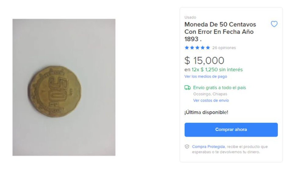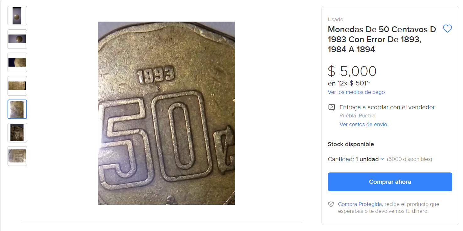 A través de Mercado Libre existen varias ofertas de monedas de 50 centavos con errores en el número impreso, y se venden desde 2 mil hasta en 15 mil pesos.