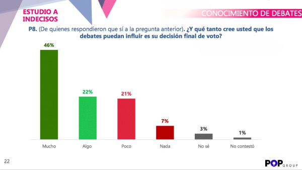 De acuerdo con una encuesta de PopGroup, los indecisos podrían jugar un papel importante en la recta final de las campañas, y es que al menos el 46% de los encuestados, identificados como indecisos, podría decidir por quién votar después del primer debate, aunque también es muy parejo entre los que creen que esta situación definiría algo o poco su elección.