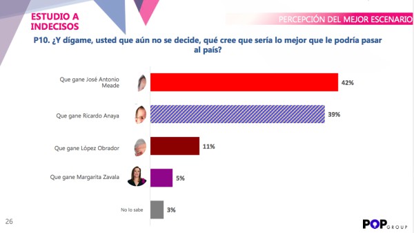 Por otra parte, la encuesta también destaca que de este grupo de indecisos ante la pregunta ¿qué sería lo mejor que le podría pasar al país? muchos consideran que el candidato del PRI, José Antonio Meade, sería la mejor opción con un 42%, seguido por Ricardo Anaya (39%) y Andrés Manuel López Obrador (11%).