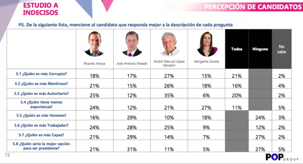 La encuesta que deja mal parado a López Obrador es la de percepción negativa del candidato, ya que de los indecisos encuestados, el 27% considera que es el más corrupto de los cuatro candidatos, el más mentiroso (26%) y el más autoritario (35%), mientras que Meade tiene una mejor percepción dentro de este grupo ya que es considerado como el más honesto con un 29% y el más trabajador, con un 28 por ciento.