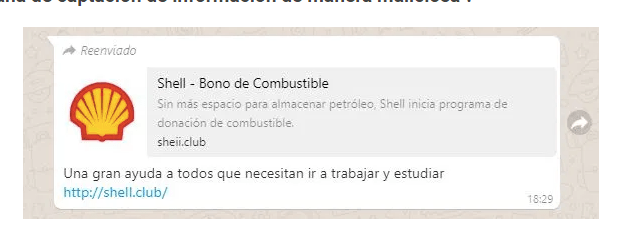 El mensaje contiene un enlace que direcciona a una página que simula ser la de Shell. Si se accede, el usuario se encuentra con otro mensaje donde se explica que Shell estará regalando por tres meses combustible gratis a las personas que regresan a su trabajo o escuela después del periodo de cuarentena. Una vez que el usuario ingresa sus datos, le indican que puede solicitar un supuesto bono equivalente a cuatro tanques de combustible llenos por mes durante los próximos tres meses. Al finalizar los pasos le piden reenviar el mensaje a 15 contactos de WhatsApp y posteriormente aparece una advertencia de que el dispositivo ha sido infectado por un virus por lo que recomiendan instalar la aplicación 'Virus Hunter 2020'. En semanas pasadas también se ha suplantado la identidad de Pemex y Repsol para este nuevo tipo de ciberfraude.? #PEMEX?? alerta sobre fraudes para efectuar depósitos bancarios a cambio de bonos de gasolina.https://t.co/eZQ7Hh1GXb pic.twitter.com/45sQDDlav4