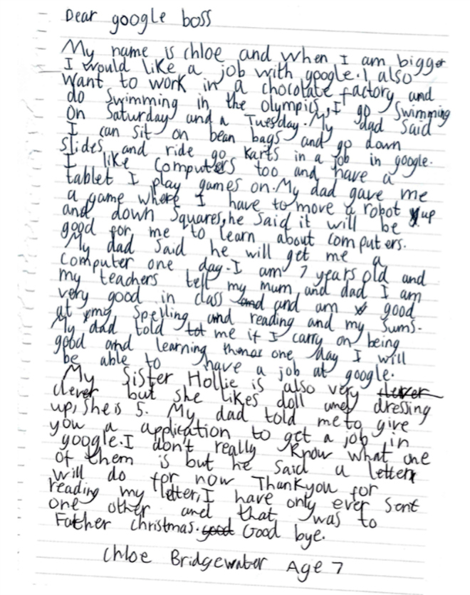 Todo comenzó cuando Chloe Bridgewater de Hereford, Reino Unido, escribió una carta en la que le pedía 'al jefe de Google' que la dejara trabajar en sus oficinas de Silicon Valley.