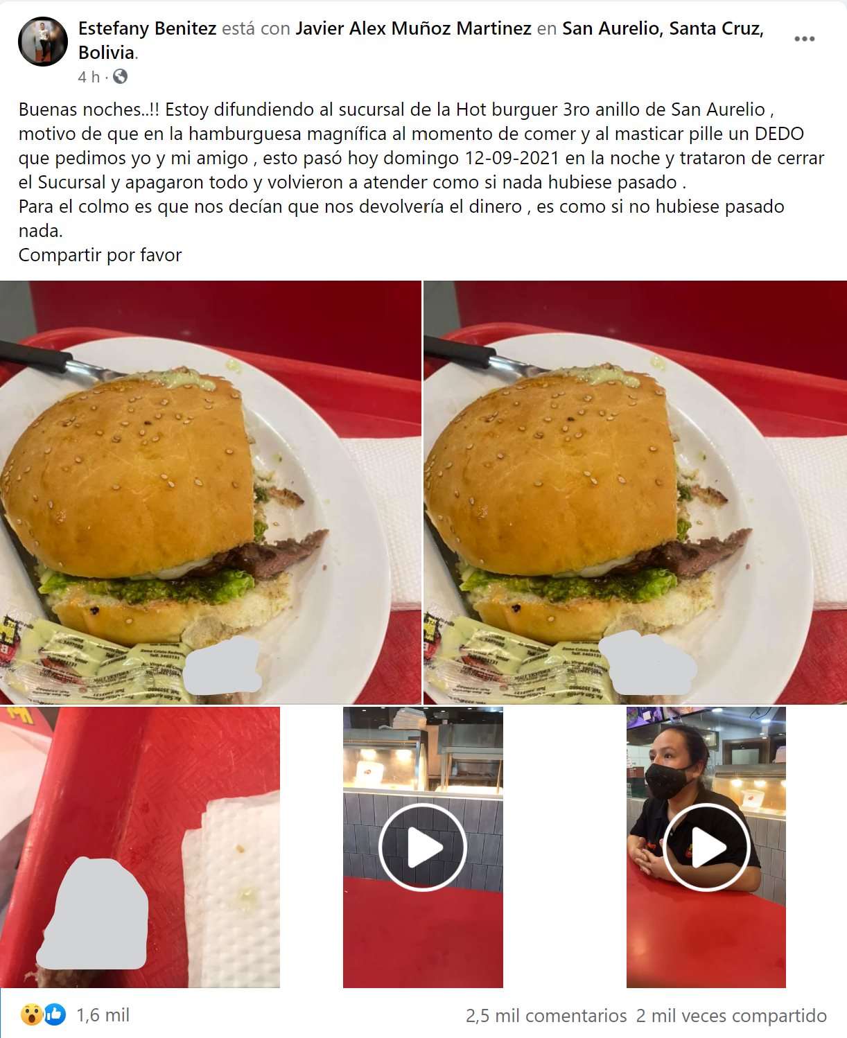 Luego de que se viralizará la denuncia, la empresa explicó en un comunicado que el dedo en la hamburguesa se debió a un "incidente fortuito" que ocurrió con uno de sus empleados, quien ya se encontraba en etapa de recuperación. Edson Claure, director de la Fuerza Especial de Lucha contra el Crimen, confirmó a medios locales que en días pasados un trabajador perdió parte de su dedo índice cuando preparaba el embutido de carne. Mientras que el Viceministerio de Defensa de los Derechos del Usuario y Consumidor decidió clausurar la sucursal de forma temporal y les impuso una multa.