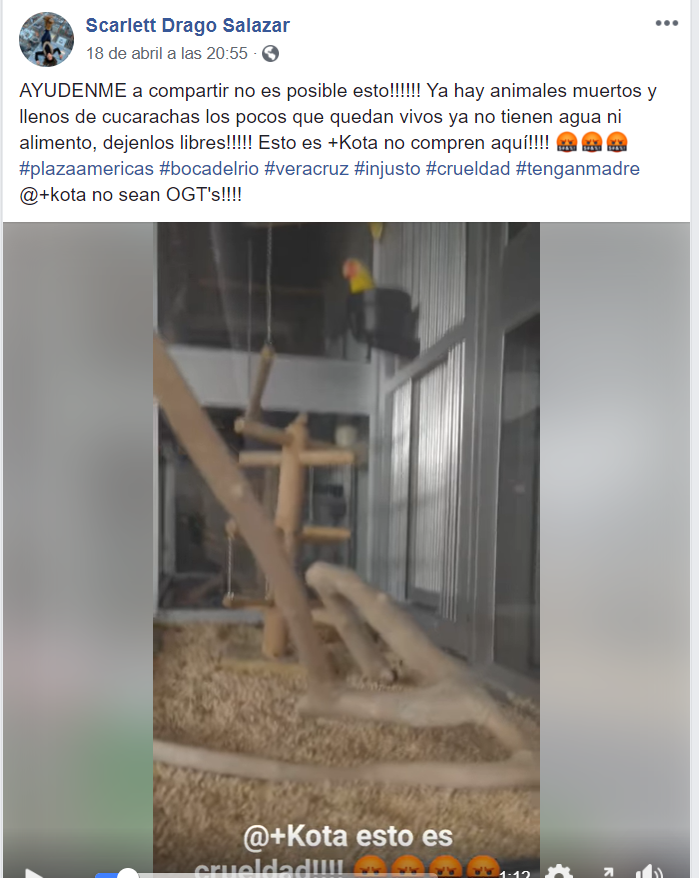 La usuaria identificada como Scarlett Drago Salazar afirmó que ya había algunos animales muertos y las vitrinas estaban llenas de cucarachas por lo que pidió ayuda para que liberen a los animales que aún están vivos."Ayúdenme a compartir no es posible esto. Ya hay animales muertos y llenos de cucarachas los pocos que quedan vivos ya no tienen agua ni alimento, déjenlos libres. Esto es +KOTA no compren aquí", afirmó la usuaria.
