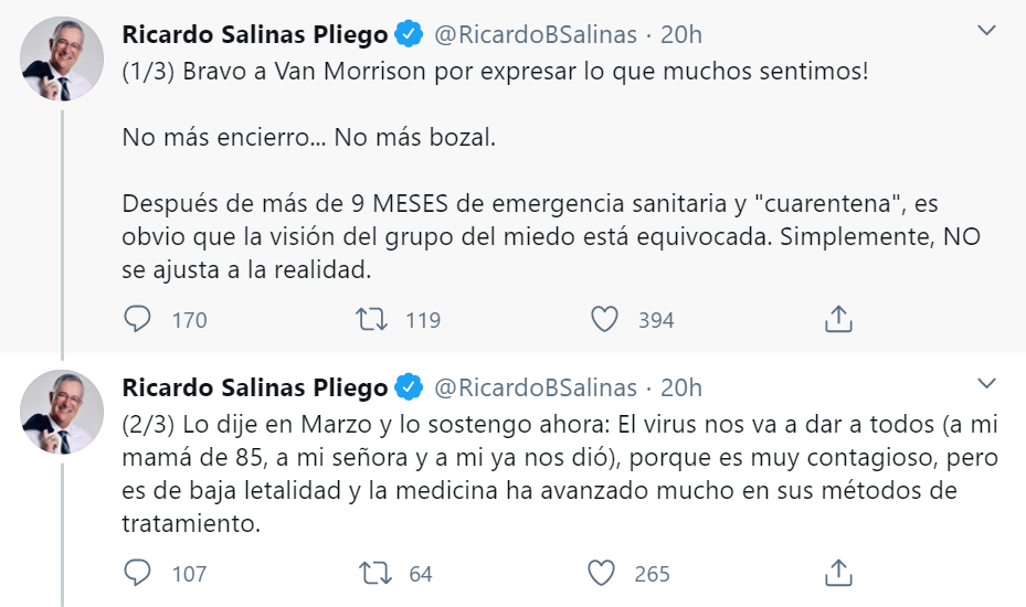 Ya basta! No más encierro! No más bozal!https://t.co/0gZG6dOAUU — Ricardo Salinas Pliego (@RicardoBSalinas) December 15, 2020