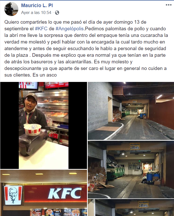 "Pedimos palomitas de pollo y cuando la abrí me lleve la sorpresa que dentro del empaque tenía una cucaracha... Pedí hablar con la encargada la cual tardó mucho en atenderme. Después me explico que era normal ya que tenían en la parte de atrás los basureros y las alcantarillas", relató el cliente en su cuenta de Facebook.