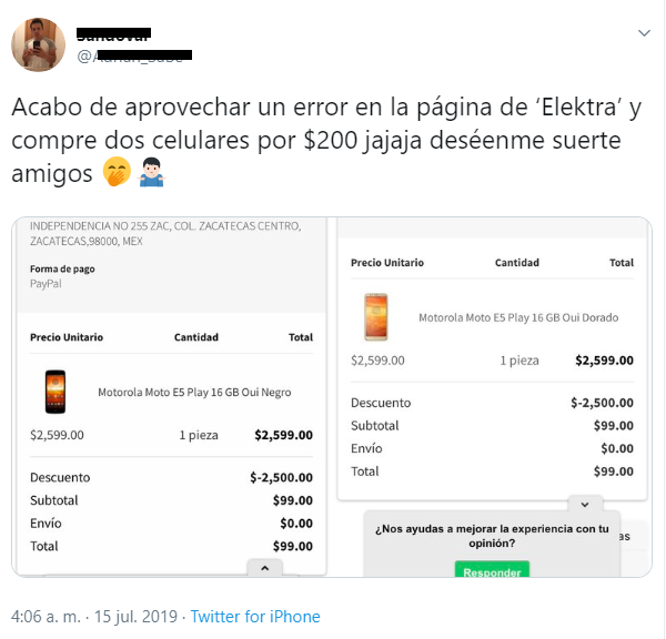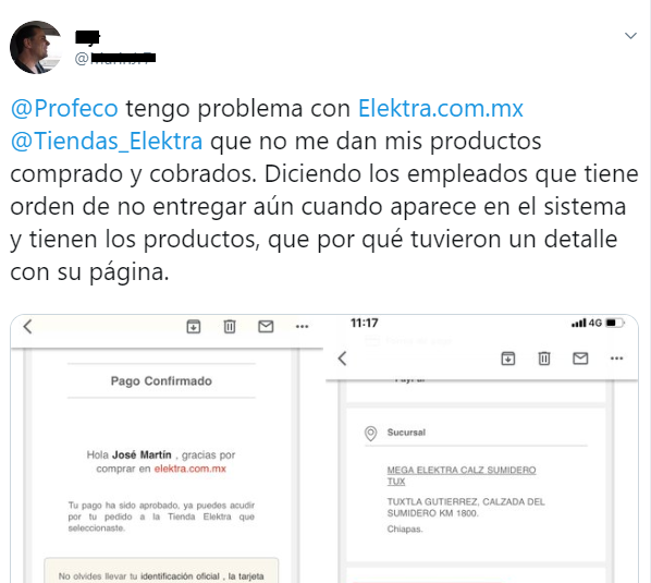 Un usuario relató en su Twitter que incluso fue a la tienda física para que le dieran sus productos, pero el personal se negó diciendo que tenían la orden de no entregar los pedidos por un error en su página.@Profeco : Elektra no me quieres hacer entrega de mis pedidos, aún cuando fueron confirmados ¿qué procede? pic.twitter.com/LlfOZdm562