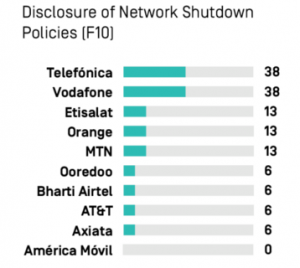 Telefónica y Vodafone obtuvieron el mayor porcentaje, de 38%, en el indicador de transparencia sobre sus políticas de cortes a la red, seguidos de Etisalat, Orange y MTN, con 13%; Ooredoo, Bharti Airtel, AT&T y Axiata, con 6%; y América Móvil, con 0%.