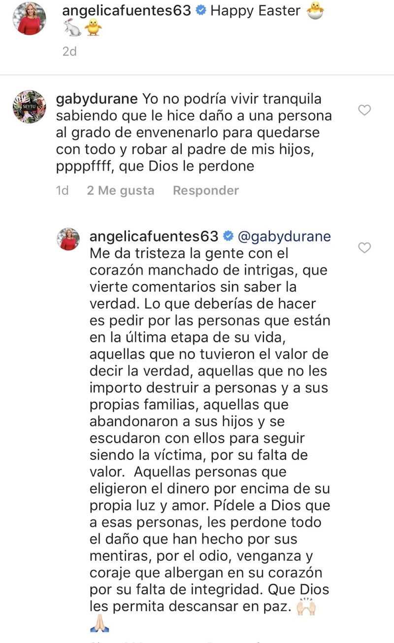 "Me da tristeza la gente con el corazón manchado de intrigas, que vierte comentarios sin saber la verdad. Lo que deberías de hacer es pedir por las personas que están en la última etapa de su vida, aquellas que no tuvieron el valor de decir la verdad, aquellas que no les importó destruir a personas y a sus propias familias, aquellas que abandonaron a sus hijos y se escudaron con ellos para seguir siendo la víctima, por su falta de valor. Aquellas personas que eligieron el dinero por encima de su propia luz y amor. Pídele a Dios que a esas personas, les perdone todo el daño que han hecho por sus mentiras, por el odio, venganza y coraje que albergan en su corazón por su falta de integridad. Que Dios les permita descansar en paz”, escribió Fuentes en su Instagram.