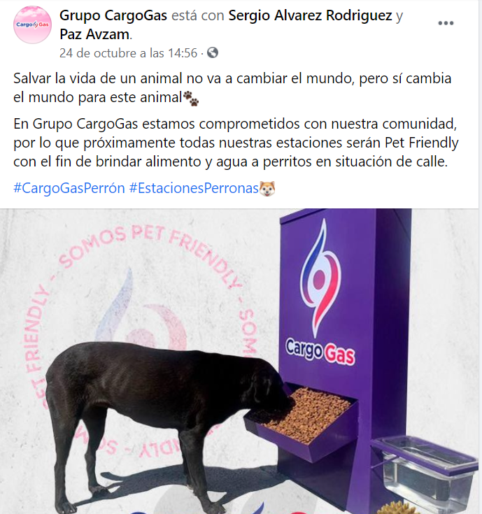 "Salvar la vida de un animal no va a cambiar el mundo, pero sí cambia el mundo para este animal... próximamente todas nuestras estaciones serán Pet Friendly con el fin de brindar alimento y agua a perritos en situación de calle", escribió la empresa en sus redes sociales.