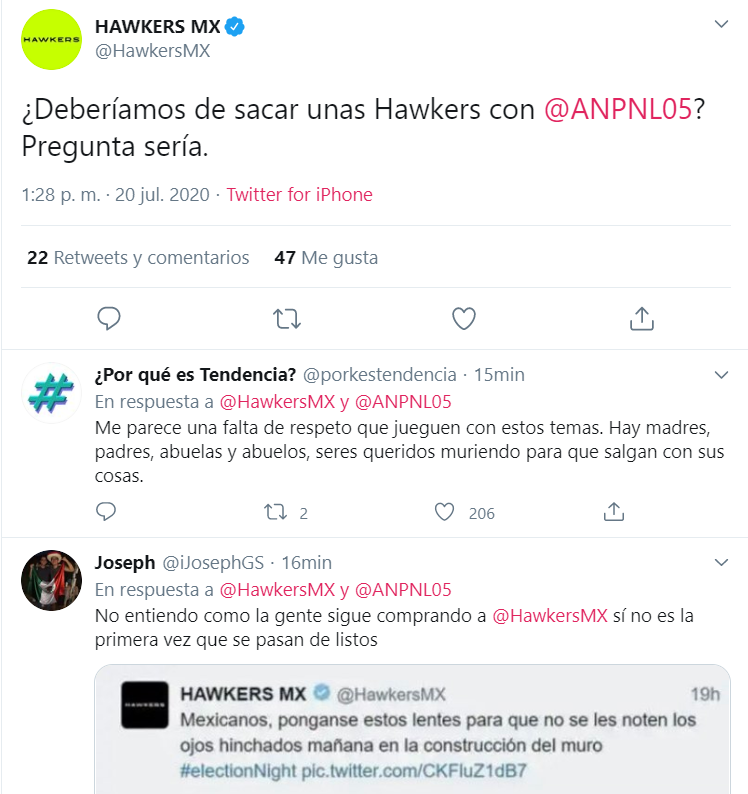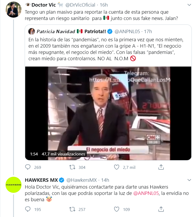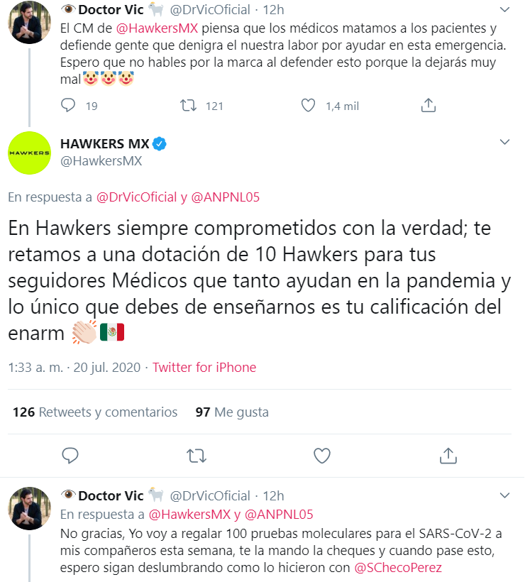 "Hola Doctor Vic, quisiéramos contactarte para darte unas Hawkers polarizadas, con las que podrás soportar la luz de @ANPNL05, la envidia no es buena", escribieron junto a una cara de payaso.Doctor Vic lamentó que el comunity manager de Hawkers defendiera a una persona que denigra su labor en la pandemia, y aunque le ofrecieron regalarle lentes para sus seguidores, él se negó y dijo que prefería regalarles pruebas para el SARS-CoV-2.