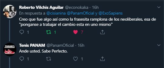 Luego otro usuario tuiteo que básicamente le quisieron decir la típica "frasecita" de neoliberales "ponganse a trabajar el cambio está en uno mismo", a lo que Panam respondió: "ande usted. Sabe perfecto.