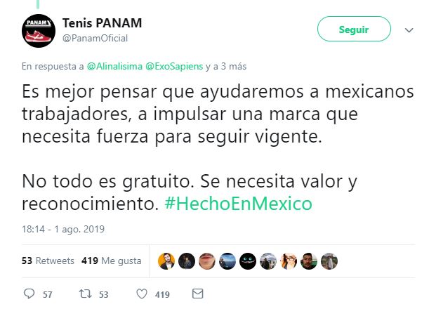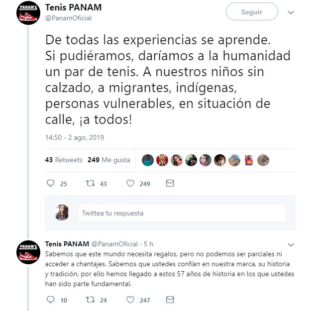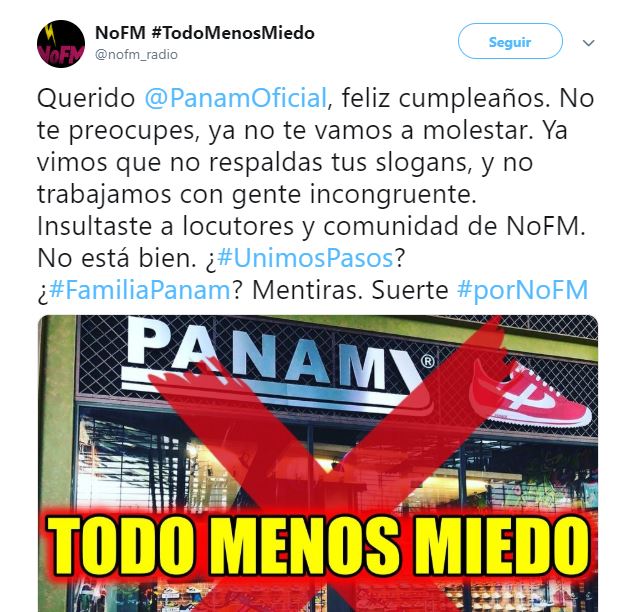 La polémica se generó porque Panam le respondió que preferían ayudar a mexicanos trabajadores "a impulsar una marca que necesita fuerza para seguir vigente. No todo es gratuito. Se necesita valor y reconocimiento".Estimados amigos de @PanamOficial, escuchen el clamor de la historia. @nofm_radio es el lugar. Se agradece el rt de todos mis seguidores. #todomenosmiedo #soymexicanosoypanam. pic.twitter.com/KzVQoOszZE