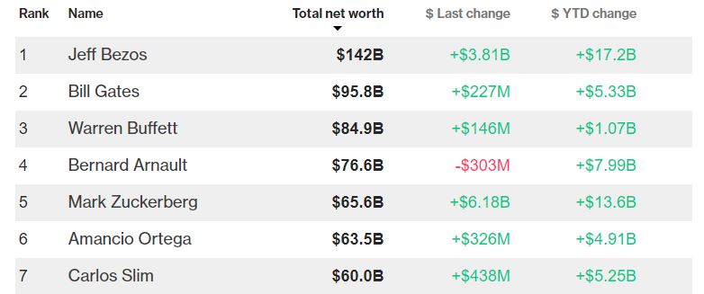 El ranking lo encabeza el fundador de Amazon, Jeff Bezos, con 142 mil mdd; seguido por el fundador de Microsoft, Bill Gates, con 95.8 mil mdd; el afamado inversionista Warren Buffett, con 84.9 mil mdd y Bernard Arnault, presidente del conglomerado LVMH, con 76.6 mil mdd.