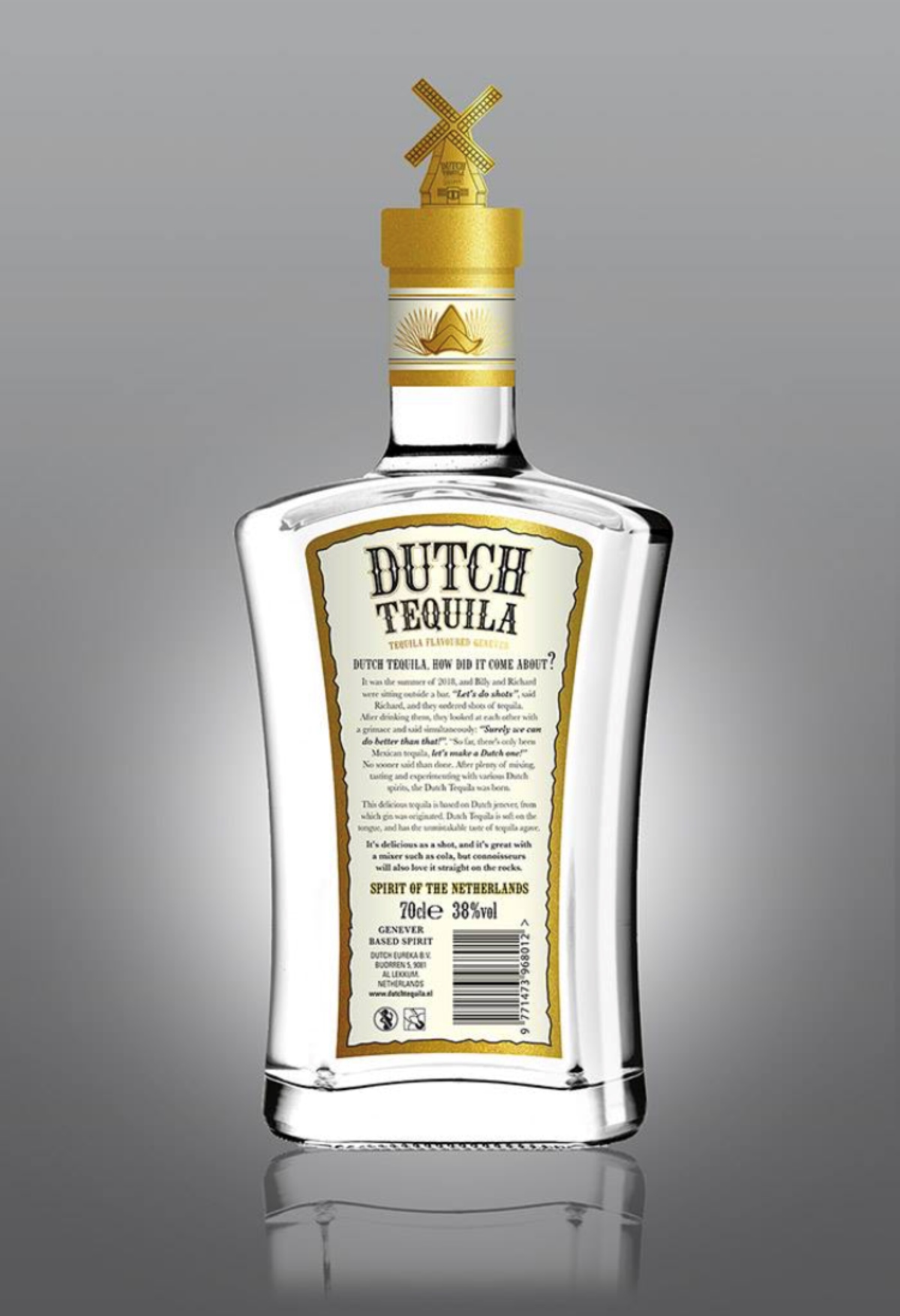 En la parte trasera de la botella relatan cómo se les ocurrió la idea de crear un tequila holandés.“Era el verano de 2018. Billy y Richard estaban sentados afuera de un bar. ‘Vamos por unos tragos’, dijo Richard, y ordenaron unos caballitos de tequila. Después de beberlos se miraron uno al otro con una mueca y exclamaron simultáneamente: ‘Seguramente podemos hacer algo mejor que esto. Hasta ahora sólo ha habido tequila mexicano, ¡vamos a hacer uno holandés!'”.Por el momento la empresa holandesa adoptó un nuevo nombre para sacar su bebida, que sería 'Dutch Genquila' en lo que se resuelve la demanda.