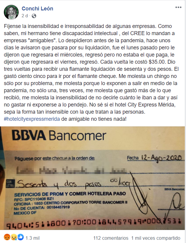 A través de Facebook la usuaria Conchi León, denunció que el Hotel City Express Mérida había despedido a su hermano, quien padece una discapacidad intelectual y sólo le dieron 62 pesos de liquidación.